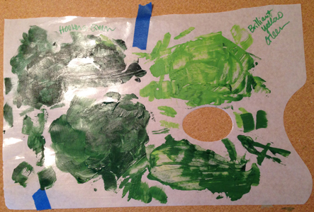 This time when I mixed my paint I used the disposable palette sheets I bought at the art store. These are perfect for me, because I hate cleaning up. I also bought a palette about the size of the sheet, to support it. When I was done, I was scraping off the paint I wanted to save, when I realized I could write on the sheet to label the paints and the mixes. This is so helpful! I have a terrible memory and sometimes don’t return to painting for several days (or even weeks). I guess I answered my own question. But I would love to hear other ideas! 🙂