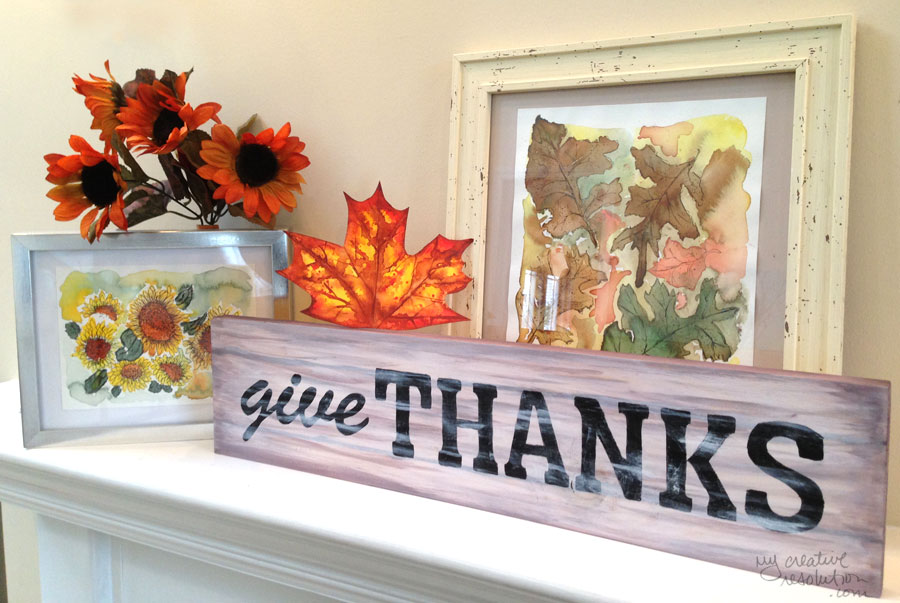 Happy Thanksgiving! My Fall mantle has become a mini gallery of some of my favorite Fall projects: sunflowers, Fall leaf, watercolor and ink leaves and the “give Thanks” Thanksgiving sign. I think tomorrow I need to start on some Winter/Christmas projects!