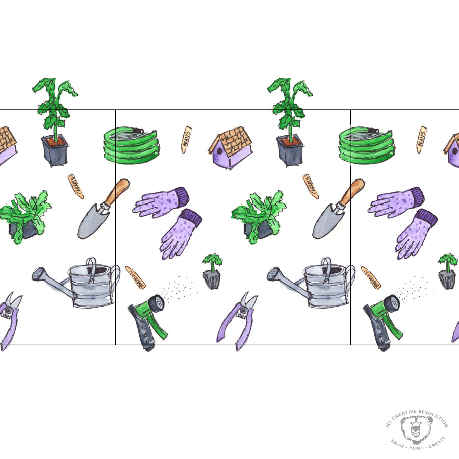 This gardening pattern, my March pattern, is the first I’ve painted in watercolor. The other two patterns (art/January and love/February) were painted in Photoshop. I limited the number of colors I used, so the items would be uniform. I scanned the illustrations and arranged them in Photoshop.