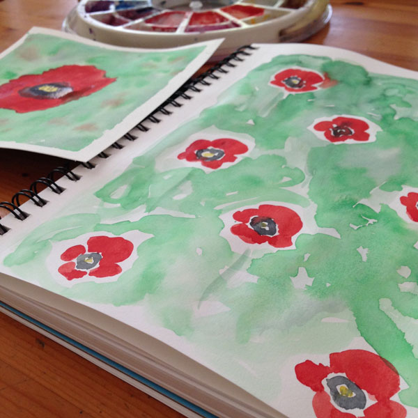 Yesterday I painted a pattern of Poppies in my sketchbook. Then I did one Poppy on watercolor paper. There were things I wanted to change and improve upon, so I did another version (above) of a single Poppy. I’m really happy with it which shows me that sometimes you have to study and practice a subject to get it right.