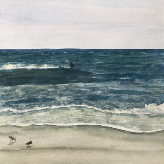 The small box of gouache paints I have contains cyan, magenta, yellow, white, and black. It is considered a “mixing box” – from it you can mix any colors. I think I bought it because I heard about gouache and wanted to try it. But it remained mostly unused until this year. The white is called Primary White. Since I’ve been using the white quite often it is running out. When I went to order a new tube of white – several different whites gouaches came up online – Zinc, Permanent, etc. I wondered, “What was the difference?” The comments on this online page shed a little bit of light, but mostly made me think – stick with what works. Primary white is considered good for mixing, which considering the box it came in makes sense. I don’t mix it much before using it, but I do blend it with other colors on the page as I paint. Let me know if you try painting the ocean with white gouache.