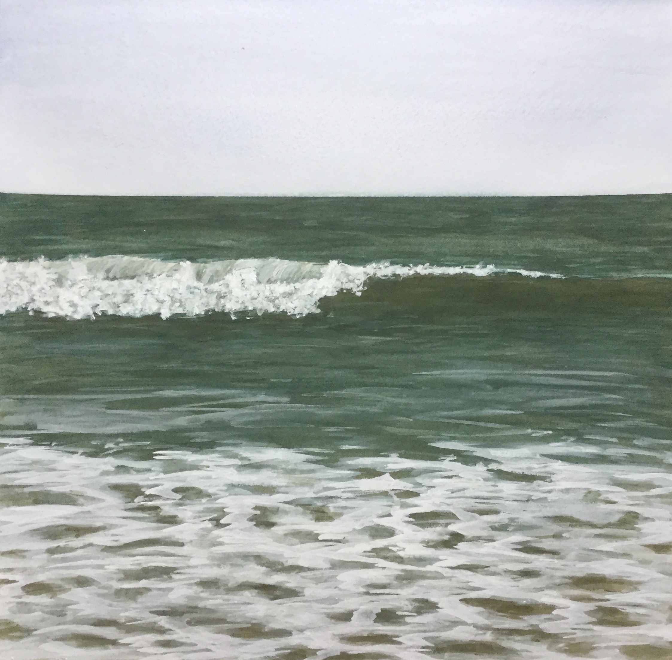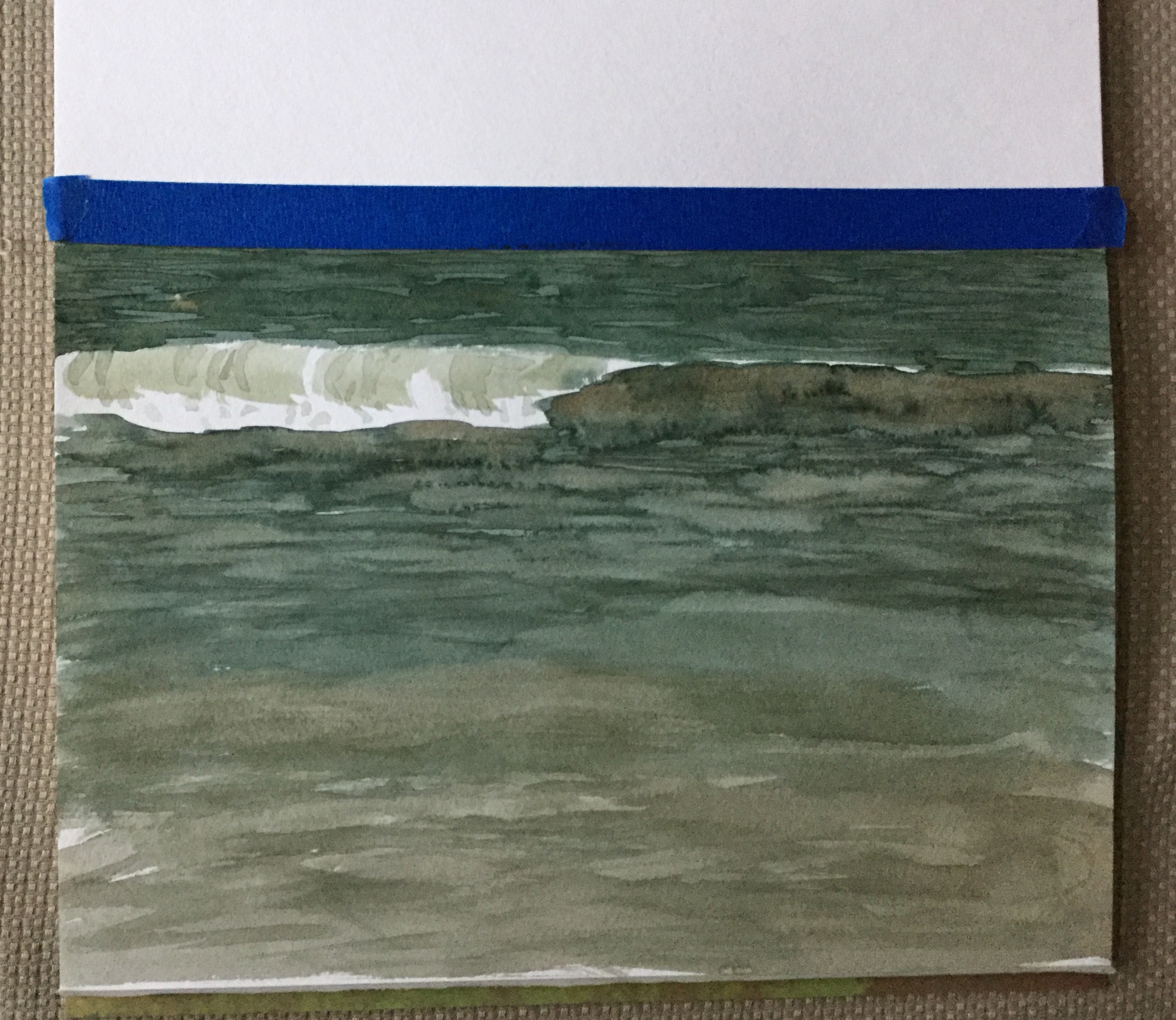 - Starting at the pencil line, paint with the blue green color. (Leave some areas white for breaking waves.) Lighten the blue green by mixing it with water as you move lower, leaving the bottom 1/3 of the circle blank.