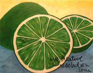 - Keep your eyes open. Ideas can come, at any time, from unlikely places. While watching TV, I saw a painting of an orange slice, on Modern Family (in Gloria and Jay’s house) and was inspired. I decided to work on an orange slice of my own, which led to limes and, currently, an apple slice.