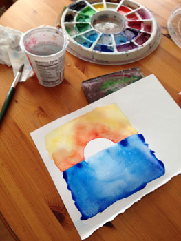Then I painted the sunset above. I was inspired by a watercolor heart I created a few weeks ago, where I blurred the edges of the heart so there was a soft edge. To blur the edges I let the paint mostly dry. With a wet brush, I pulled up some of the color at the edge of the shape. Then I soften the edge into the white area to create a fade.