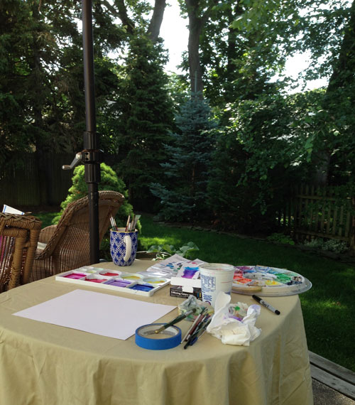 I wanted the sun to have the same soft effect as the heart and I wanted to keep the sunset simple. I painted the sky part first and let it dry before painting the bottom. I didn’t want the bottom bleeding into the sky! In addition to softening the edge of the sun, I added water (to the water) to soften the blooms.* (This word was on the tip of my tongue, but I couldn’t remember what they are called. Thank you to this link for the definition below.)