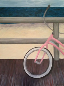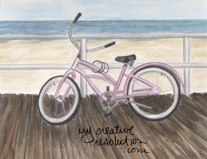 I do think stepping away from a project is a good thing, because when you come back to it you see it with a fresh eye. I was very excited about how I had “sketched” in the bicycle, until I looked at it again. I realized the tire was so small, it looked more like my banana seat bike from the ’70s than a big tire beach cruiser.