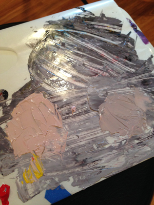 I mixed cad. red and white and added some cad. yellow to get a flesh tone, which I mixed with my base color. I wanted a color that would work as a base for the little girl, that wasn’t far off from my original (sand) base color. This way, I won’t feel intimidated to loosely sketch in the girl. Hopefully, I’ll easily be able to change any area “back” to sand if necessary.