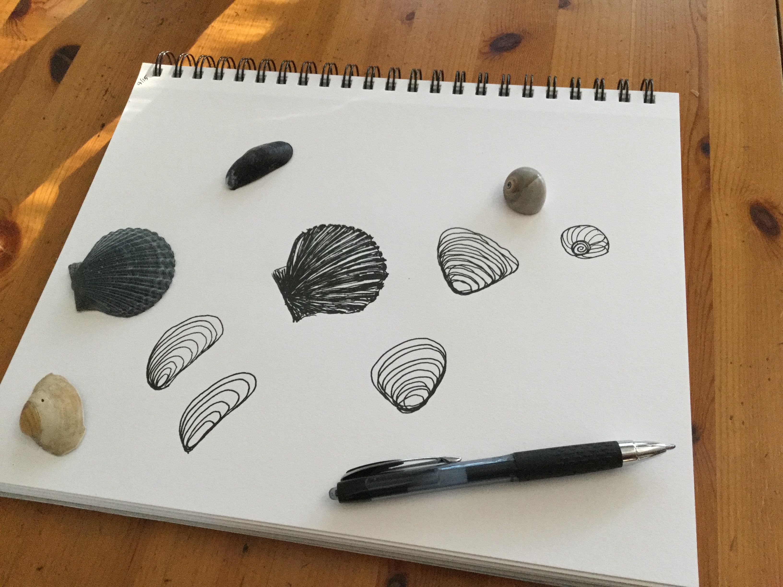 It’s a funny time of year. School has started so summer feels over. When I look around the house for something to draw, I see the shells we’ve collected. Every year I say I’ll continue creating in the beach theme after summer ends, but it loses its appeal. I get inspired by the changing leaves, and then the winter sky against bare trees, followed by the beautiful flowers of spring. I guess I’m a seasonal girl. 😀